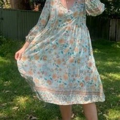 D8640BAQ Silver Wishes Aqua Floral Long- Sleeved Dress