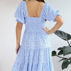 S0575A-129 Salty Bright Blue Floral Below The Knee Dress