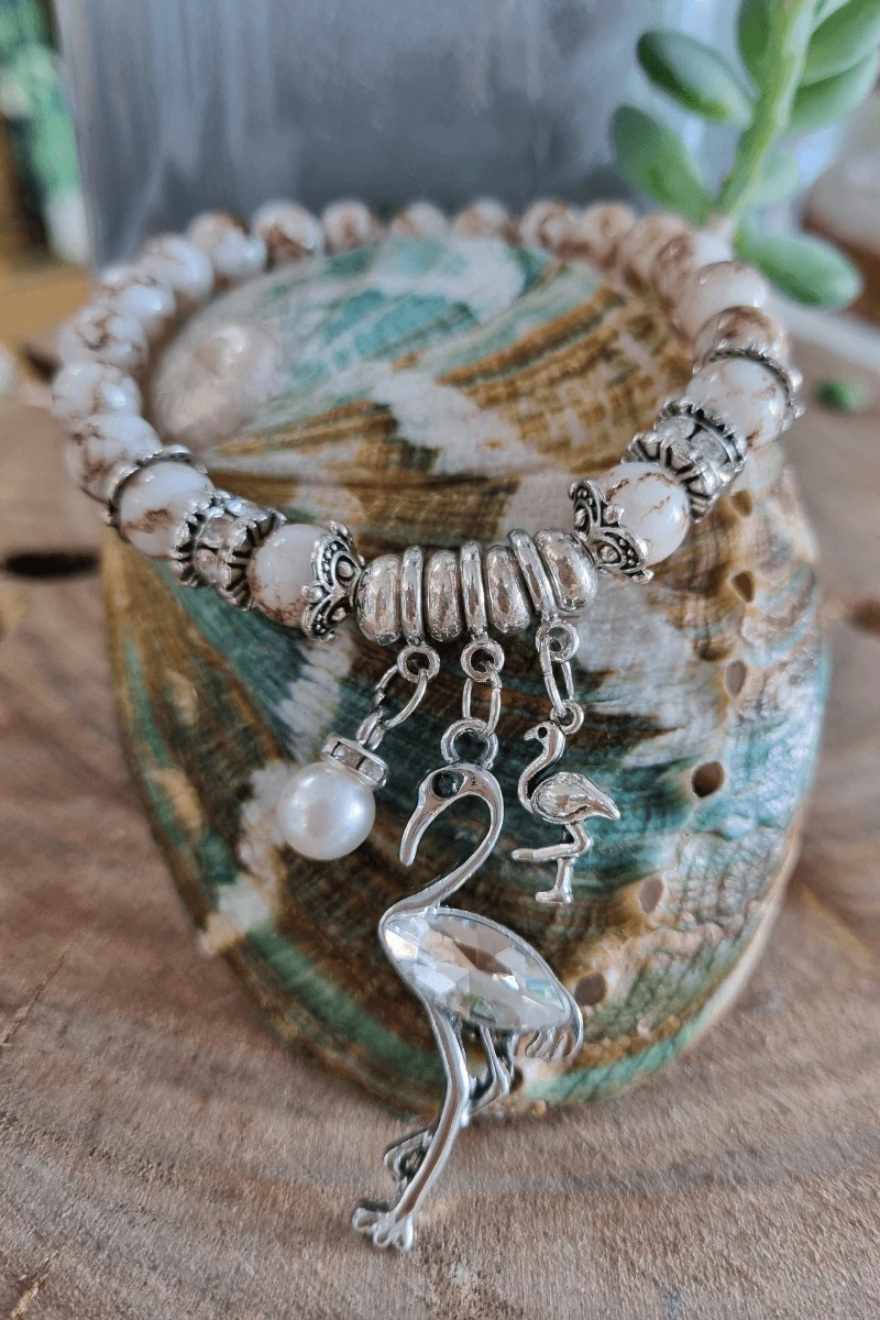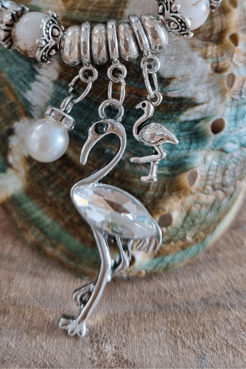 For the one who protected you most, our detailed Flamingo is the perfect gift for a special person in your life. Or treat yourself to some good vibes! This piece is made up of semi precious natural beads on an adjustable stretch string bracelet and features silver and and zurcon diamonds in detail.