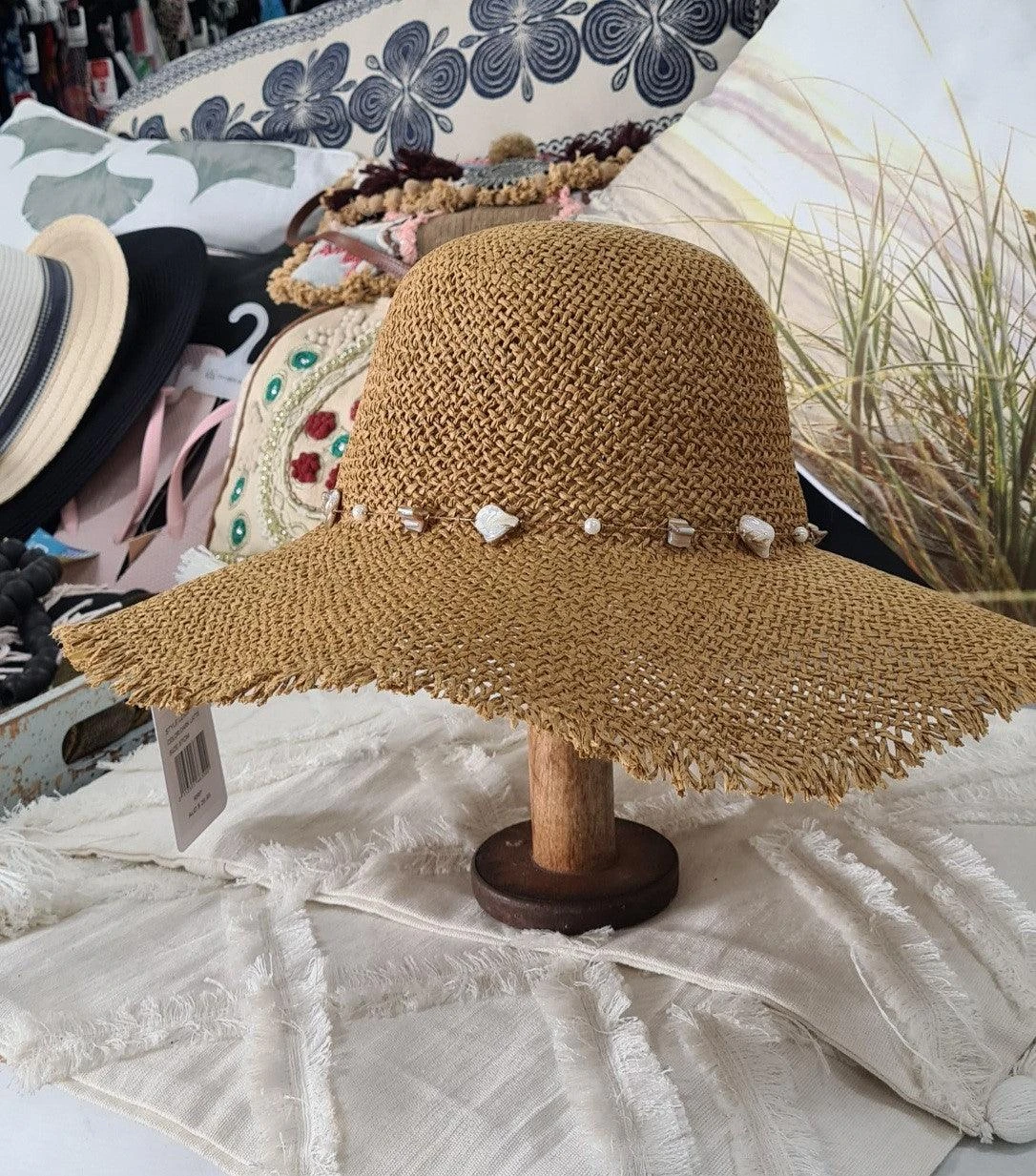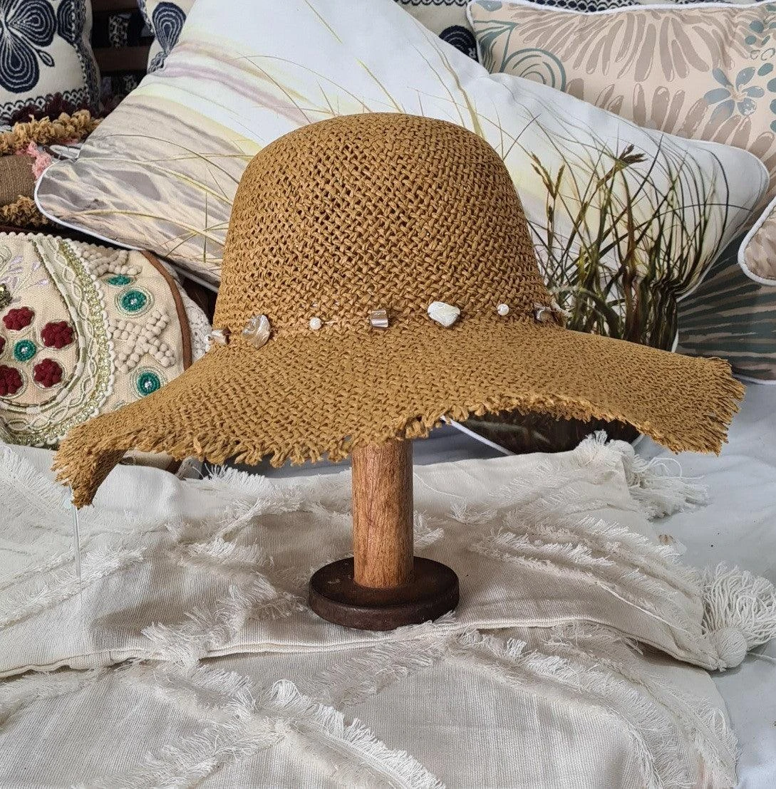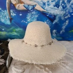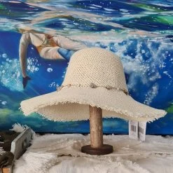 Stylish Frayed Edge Hat with Cord and Shell Detail