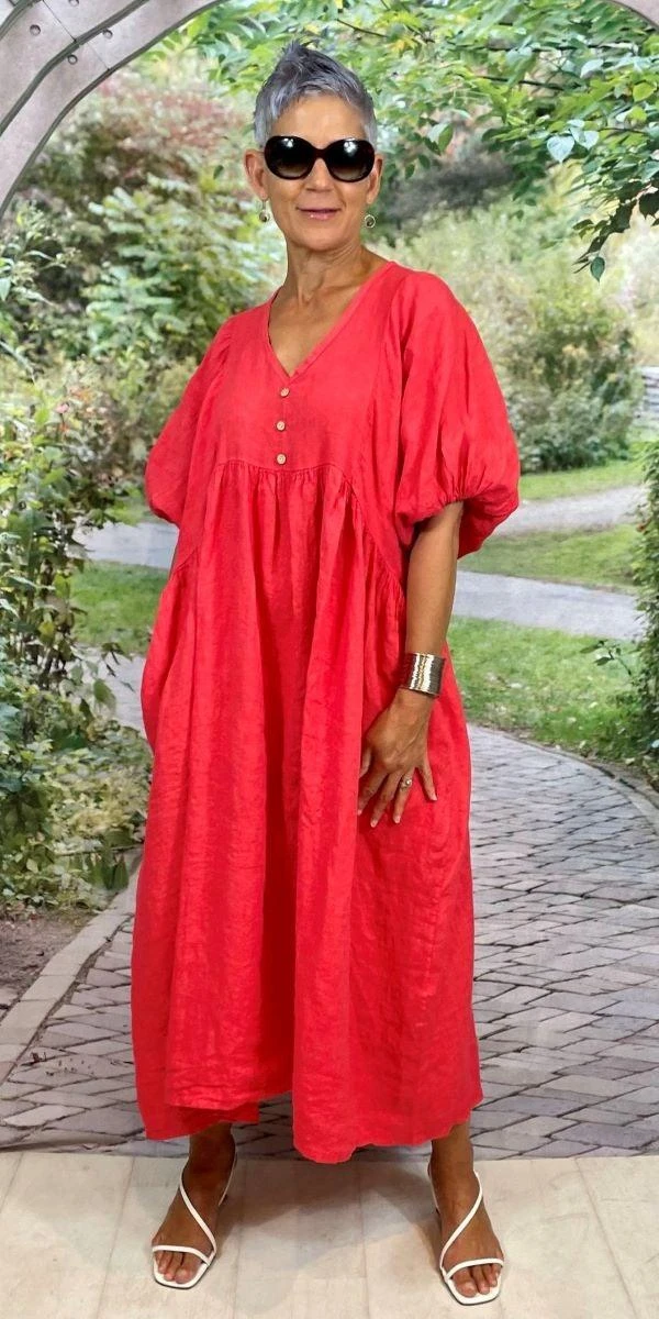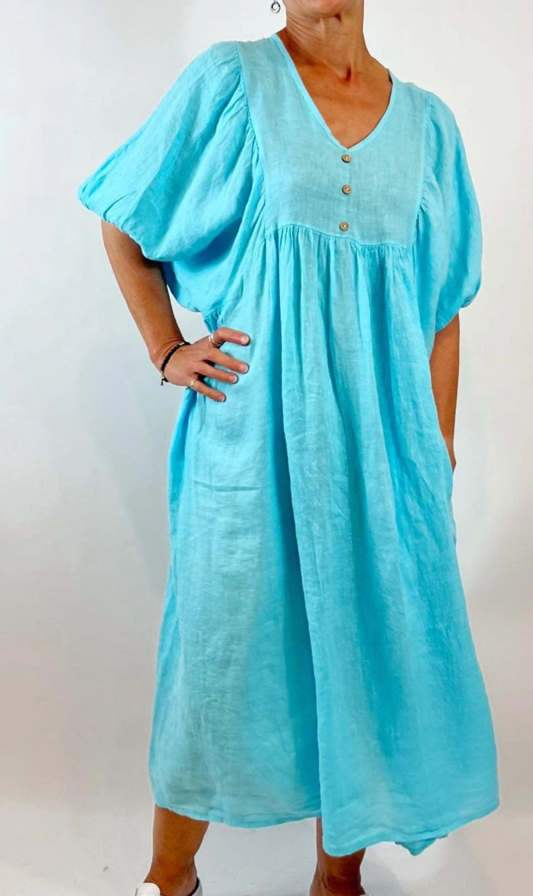 This beautiful Italian linen dress floats on the body. Below the Knee three quarter sleeve Sold out in days, now available in 7 gorgeous colours Pale Blue, White, Fuxia, Candy Pink Coral Turquoise and Bright Orange Limited stock. Â