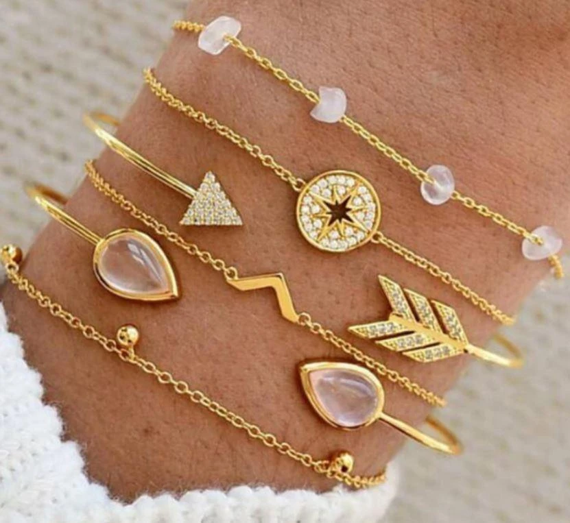 A wonderful variety of semi precious gem and alloy gold settings. all five bracelets
