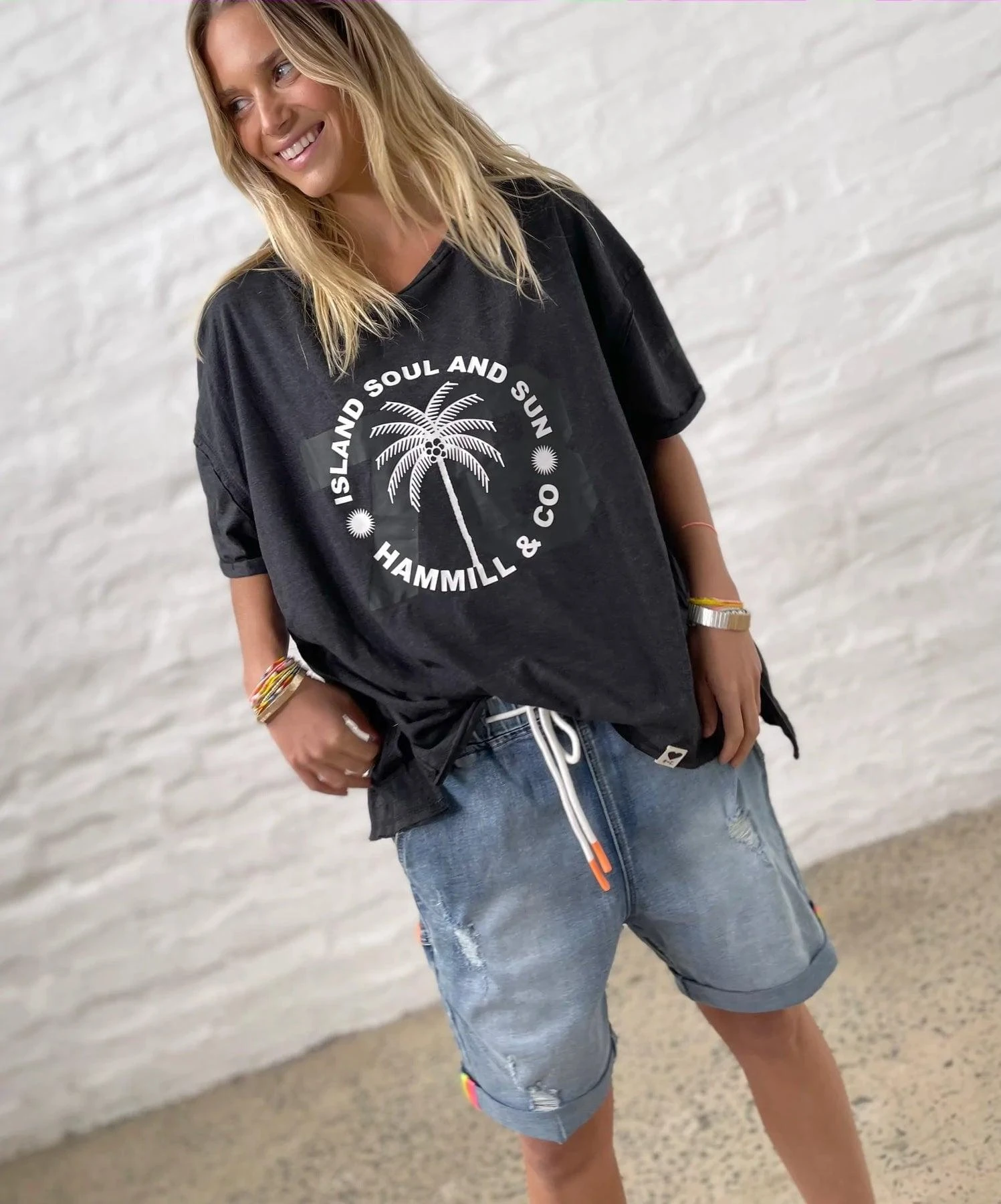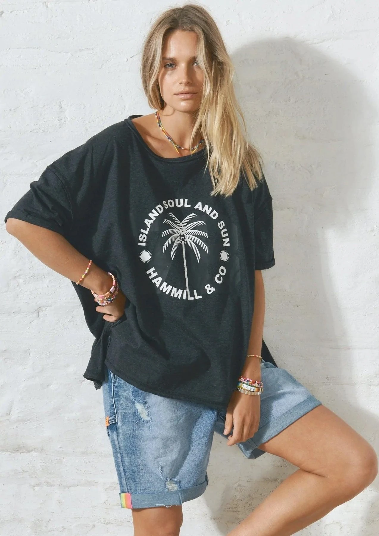 Retro Island Soul 78 print in subtle black and white outline print on our washed charcoal/black tee. A great fitting tee for summer! Wear back with your favourite shorts or throw on over your swimmers!Â