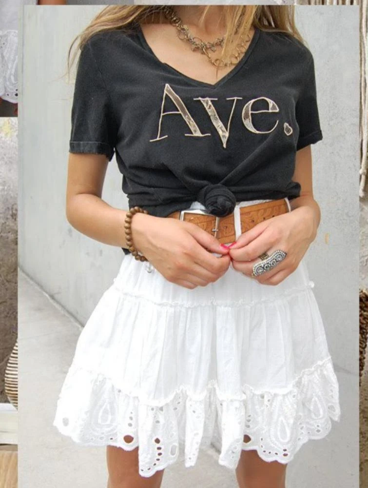 Refuge washed black Ave lace applique tee The AVE. V Neck is a wardrobe staple and features contrast lace embroidered appliqué relaxed fit with curved hemline. Team it with denim skirt for an effortless look.