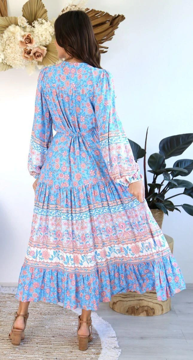 This long blue floral dress will take you to any event. 100% Rayon, it is very breathable with button detailing going to down to adjustable tie in the middle of the dress, to style your waist.