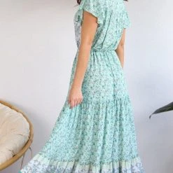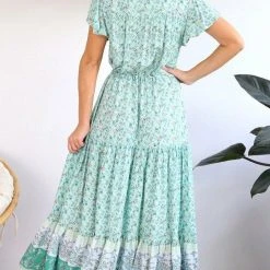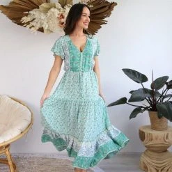 Sweetly feminine, this Dress has that carefree light weight soft bohemian spirit you love. V-neckline with button front this dress will take you from day to night. Designed with drawstring nipped-in waist and floaty, tiered hem. Finished with a cute frilled hem. Figure flattering and oh-so-comfy.