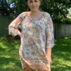 Beautiful Boho beach kaftan mid-sleeved cream base, blue and orange floral dress, with block print border
